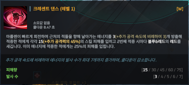 오늘의 실험글은 뎁마(데비&마를랜 캐릭터의 준말)의 w 스킬이 생각대로 적용되지 않는 것 같아 실험하기로 함 우선 테스트 할 내용은 1. 패시브가 툴팁대로 작동하는지 2. 공격속도에 비례해 투사체가 어떻게 증가하는지 3. 데미지가 어떻게 적용되는지 1. 패시브가 툴팁대로 작동하는지 스킬 설명을 대충 봤을때는 에너지 3개 방출이니 스택이 3개 새겨지겠지 하고 스킬을 사용함 그런데 실제로는 범위 내의 적에게 패시브 3스택이 새겨지는게 아니라 2개만 새겨지는거였슴 뭔가 잘못된거 같아 스킬 설명을 다시 읽어봅시다 근처의 적들을 향해 에너지를 방출해 2번째 적중 시마다 패시브를 새긴다고 함 그렇다면 총 3개 방출하므로 2번 적중하는 횟수는 1번이므로 패시브가 1개면 새겨져야 하지만 2개 새겨짐 여기서 가정을..