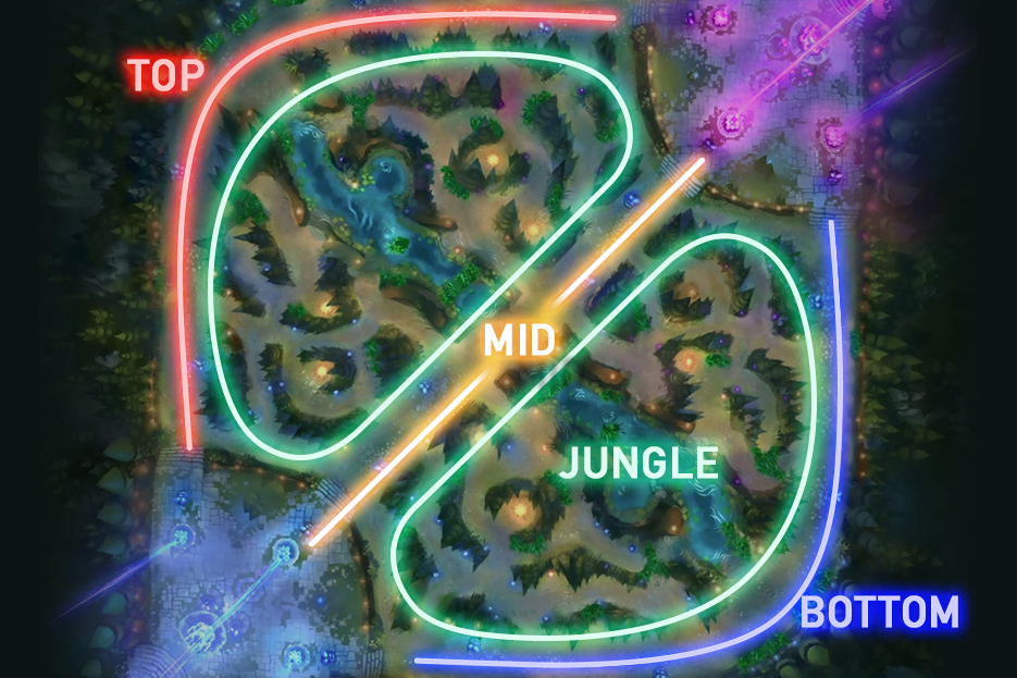 롤에는 탑, 정글, 미드, 바텀(원딜과 서포터) 이렇게 4개의 라인이 존재하며 5가지 역할군이 존재합니다