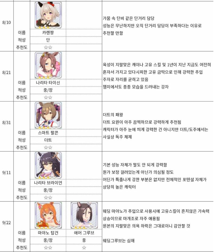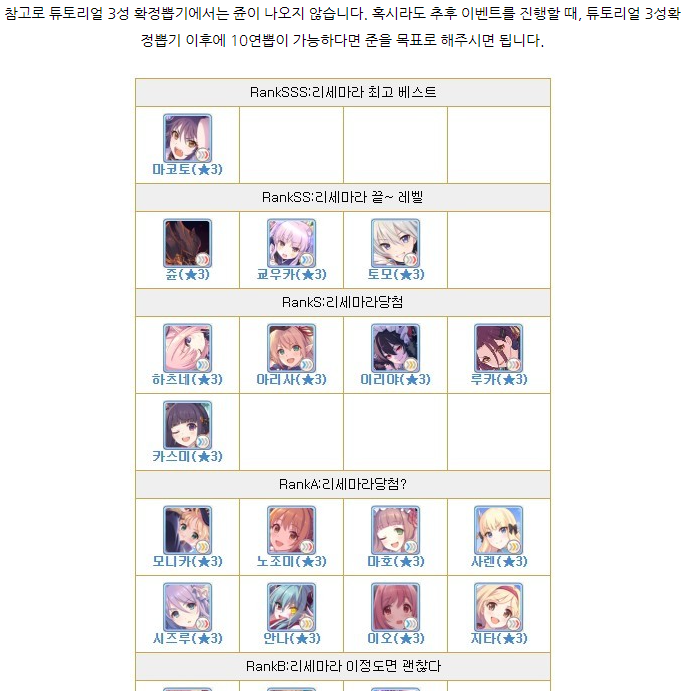 프린세스 커넥트 출시 초기에 어떤 캐릭이 가장 좋은지 나열해놓은 표의 예시입니다