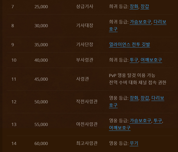 하위 순위는 사실상 큰 의미가 없기 때문에 의미가 있어지는 상급 기사 등급부터 들고 왔습니다