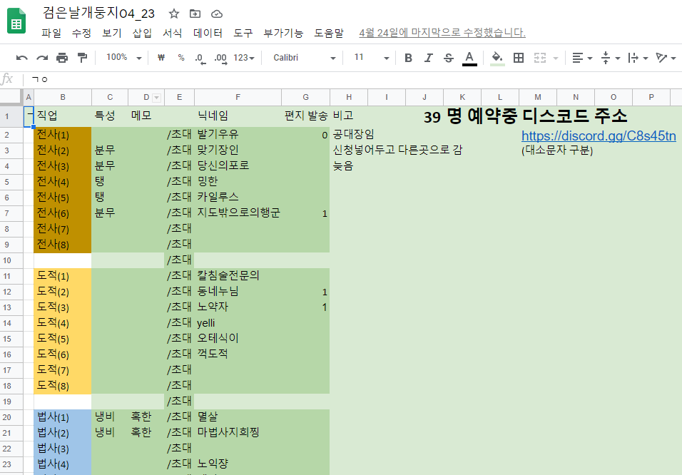 이런 식으로 미리 특성과 직업 등을 귓속말이나 우편 디스코드로 예약받고 처음 오는 분들에게는 인게임 우편 기능을 통해